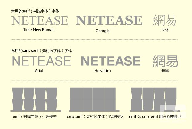 從心理模型可以看出,常規(guī)的組合排列中,無襯線字體比襯線字體的常規(guī)組合性更好一些,但處理的不好反而會(huì)呆板。