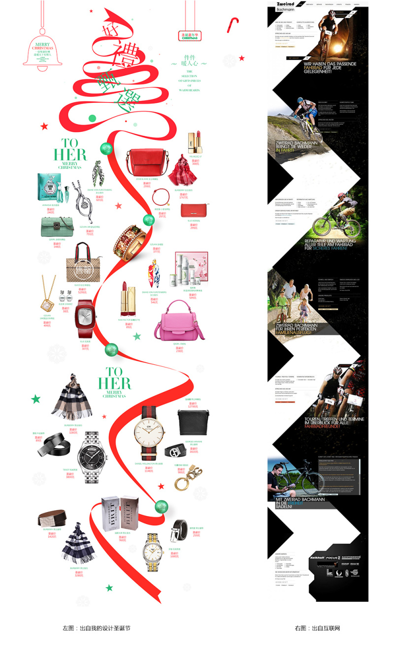 01.左圖是我當(dāng)時(shí)做的一個(gè)圣誕節(jié)的整體創(chuàng)意頁(yè)面,以禮結(jié)的形式貫穿整體設(shè)計(jì)中。當(dāng)時(shí)做的時(shí)候,就把整體的禮結(jié)元素放大化,做為主元素去表現(xiàn);