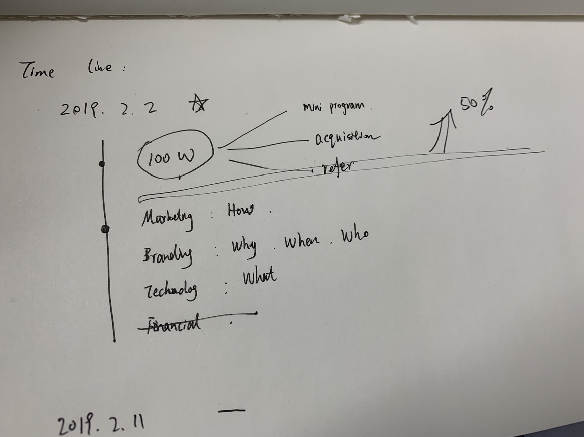 當(dāng)確定好時(shí)間節(jié)點(diǎn),活動(dòng)的策劃成為了側(cè)重點(diǎn)。因?yàn)?019年的農(nóng)歷是己亥年,而且我們也是在春節(jié)期間完成增長任務(wù),所以這次增長被定名為“己亥計(jì)劃”。我們先進(jìn)行了一個(gè)梳理,當(dāng)時(shí)的手稿和板書大概有幾十張,比較亂,我的字也比較丑大概長這樣: