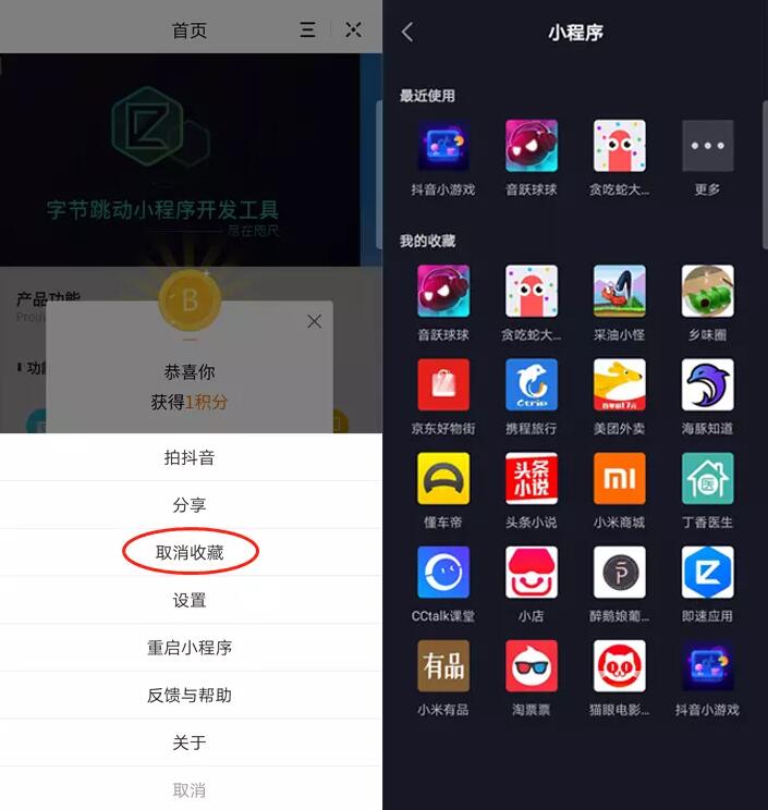 ▲抖音小程序收藏功能、小程序桌面(位于抖音“我的-三-小程序”)