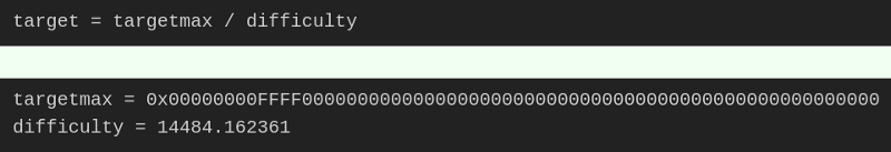 區(qū)塊鏈協(xié)議規(guī)定,使用一個(gè)常量除以難度系數(shù),可以得到目標(biāo)值(target)。顯然,難度系數(shù)越大,目標(biāo)值就越小。