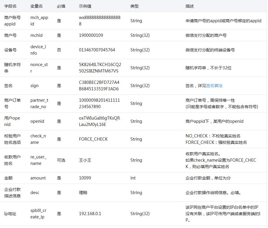 接口鏈接:https://api.mch.weixin.qq.com/mmpaymkttransfers/promotion/transfers