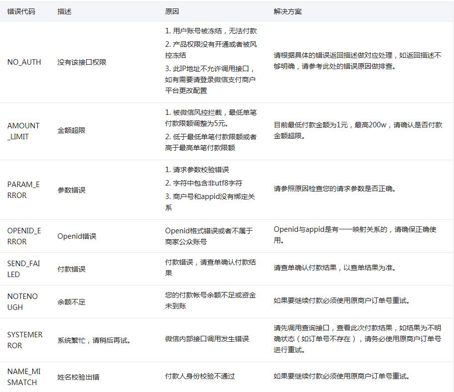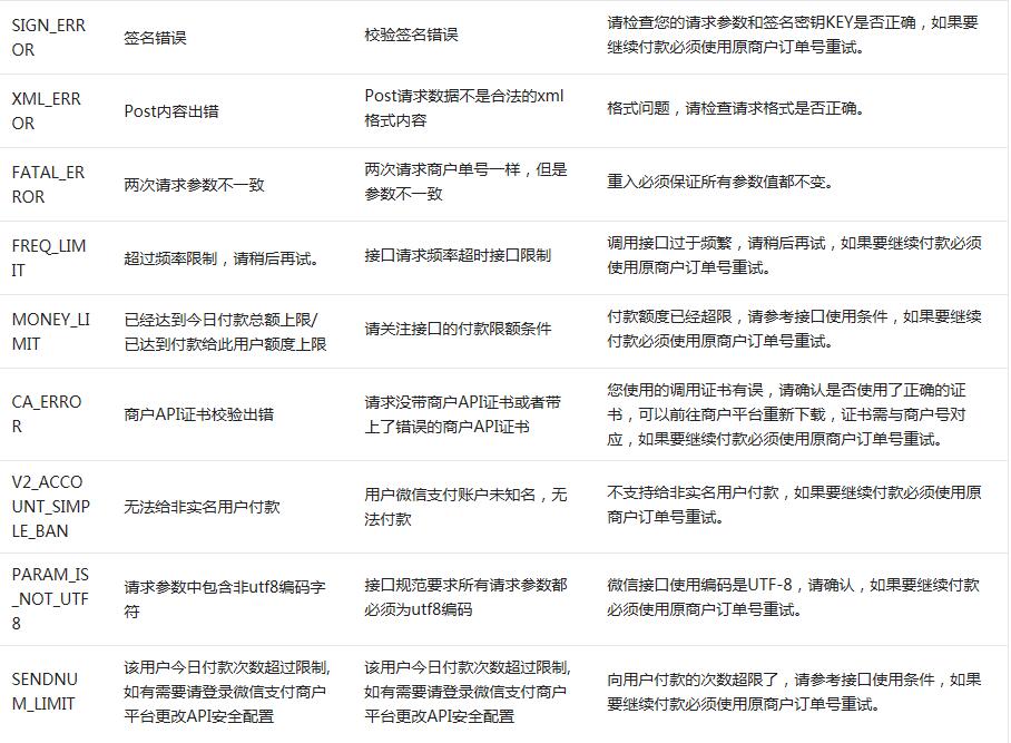 ◆ 因?yàn)殄e(cuò)誤代碼字段err_code的值后續(xù)可能會(huì)增加,所以商戶如果遇到回包返回新的錯(cuò)誤碼,請(qǐng)商戶務(wù)必不要換單重試,請(qǐng)商戶聯(lián)系客服確認(rèn)付款情況。如果有新的錯(cuò)誤碼,會(huì)更新到此API文檔中。