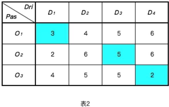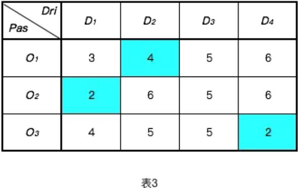 如下圖3所示,可能得到另外一種組合匹配關(guān)系:O1-D2,O2-D1,O3-D4,該種組合決策下,平均耗時(shí)約2.7分鐘,總共耗時(shí)8分鐘。