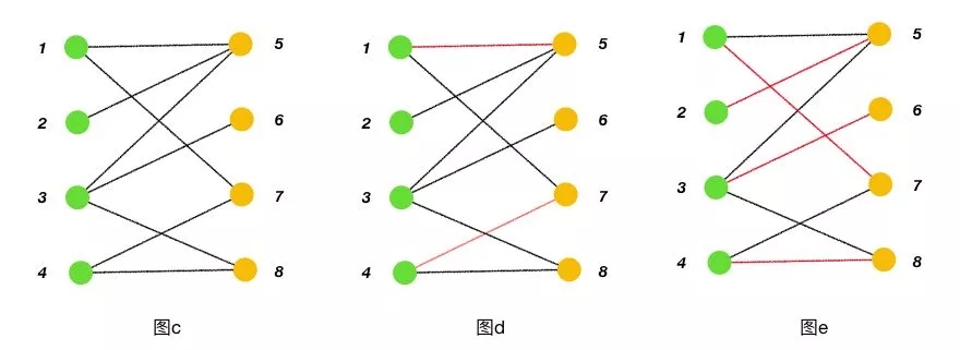 匹配:在圖論中,一個(gè)匹配是一個(gè)邊的集合,其中任意兩條邊都沒有公共頂點(diǎn)。例如,圖 d、圖 e 中紅色的邊就是圖 c 的匹配。構(gòu)成匹配的邊稱為匹配邊,匹配邊上的頂點(diǎn)稱為匹配點(diǎn)。